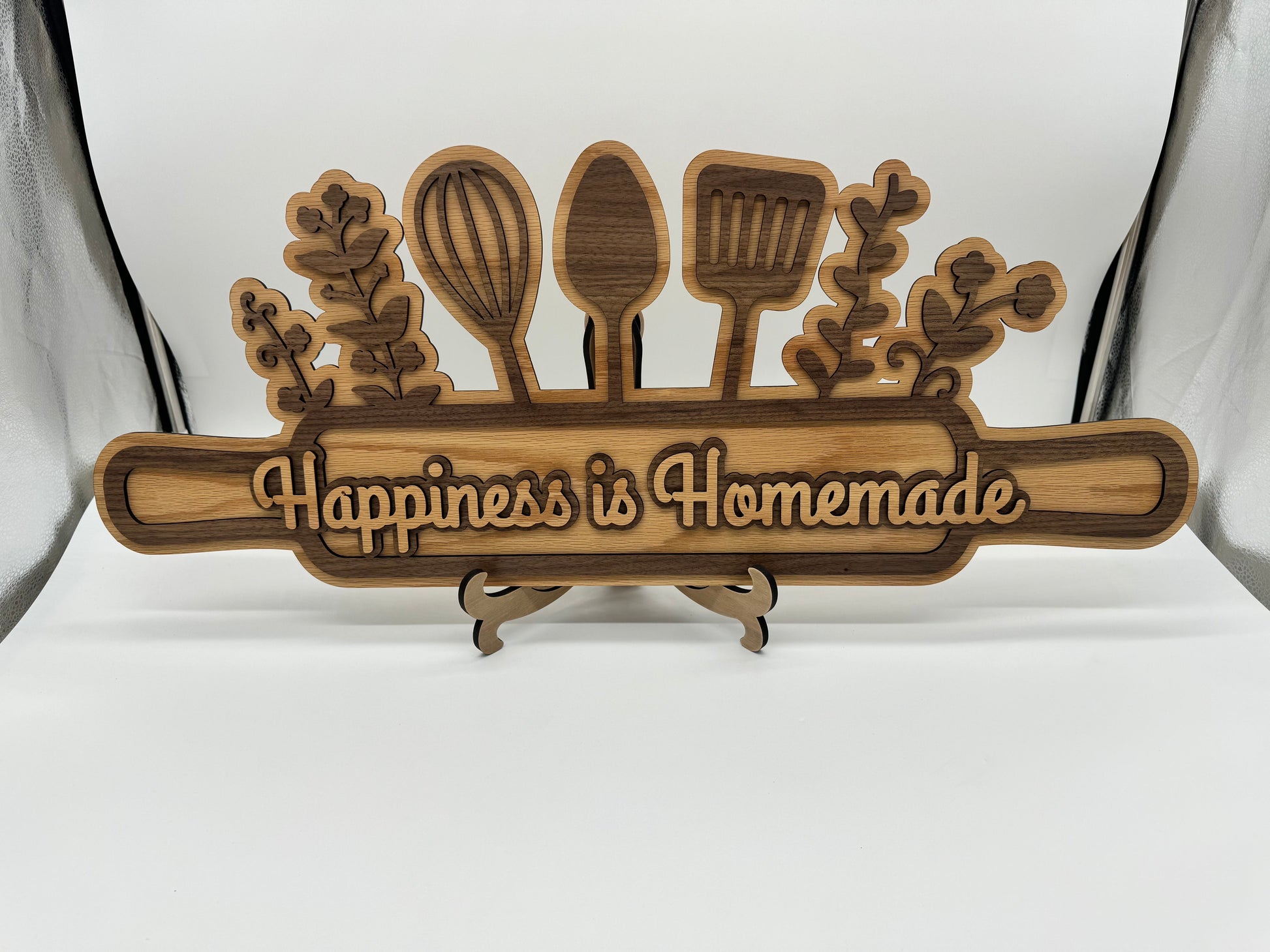 Add a touch of rustic charm to your kitchen with our handmade “Happiness is Homemade” Kitchen Decor. Crafted from beautiful maple and walnut, this engraved piece celebrates the joy and warmth of homemade meals. Bring happiness to your home and inspire your cooking with this unique decoration!